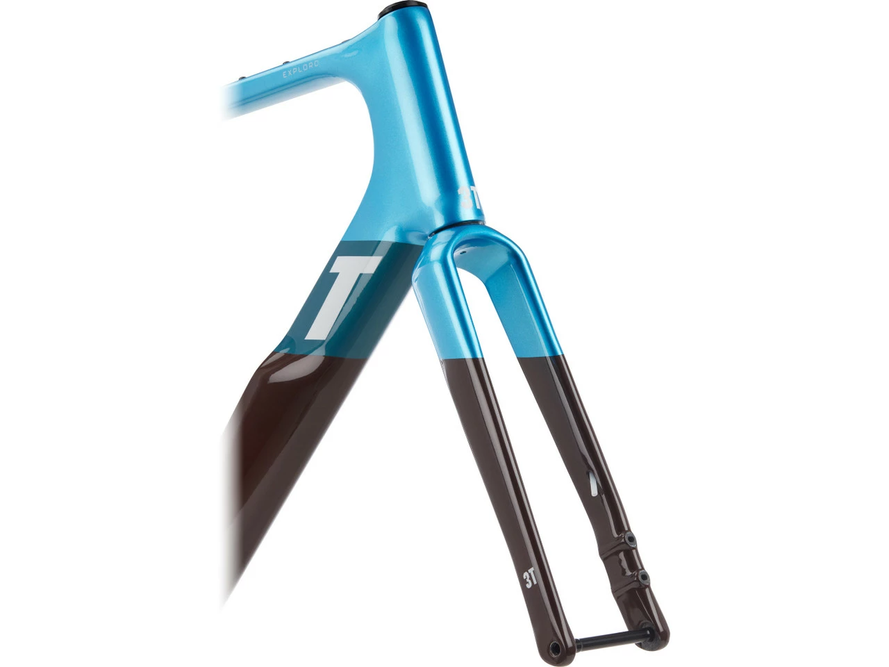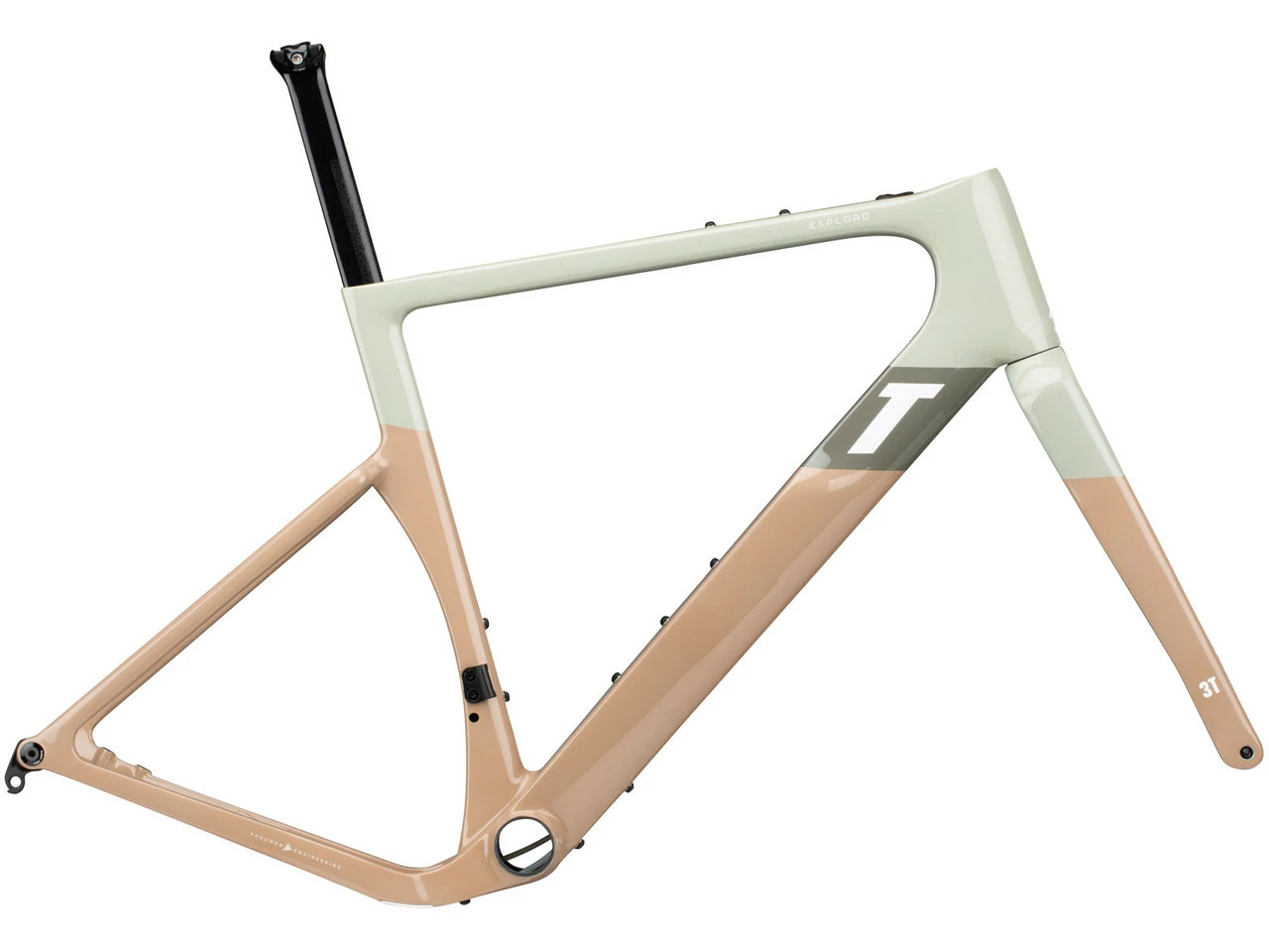 Das Exploro RaceMax Rahmenkit von 3T ist die Basis für ein Gravel-Bike aus Carbon. Je nach Ausstattung kannst Du Dir ein schnelles All-Road-Bike oder eine Gravel-Maschine mit richtig breiten Reifen aufbauen. Der aerodynamische Rahmen, verfügt über ein besonders starkes Unterrohr und ein sehr schmales Steuerrohr. In diesem Steuerrohr befindet sich jedoch ein 1,5″ starker Gabelschaft, der dem Bike Laufruhe und Stabilität verleiht. Wichtig ist außerdem genügend Reifenfreiheit. An der Gabel wird sie unter anderem durch eine minimalistische Gabelkrone realisiert. Der Rahmen selbst hat beidseitig abgesenkte Kettenstreben, wodurch auch dort eine größere Reifenfreiheit realisiert werden kann.