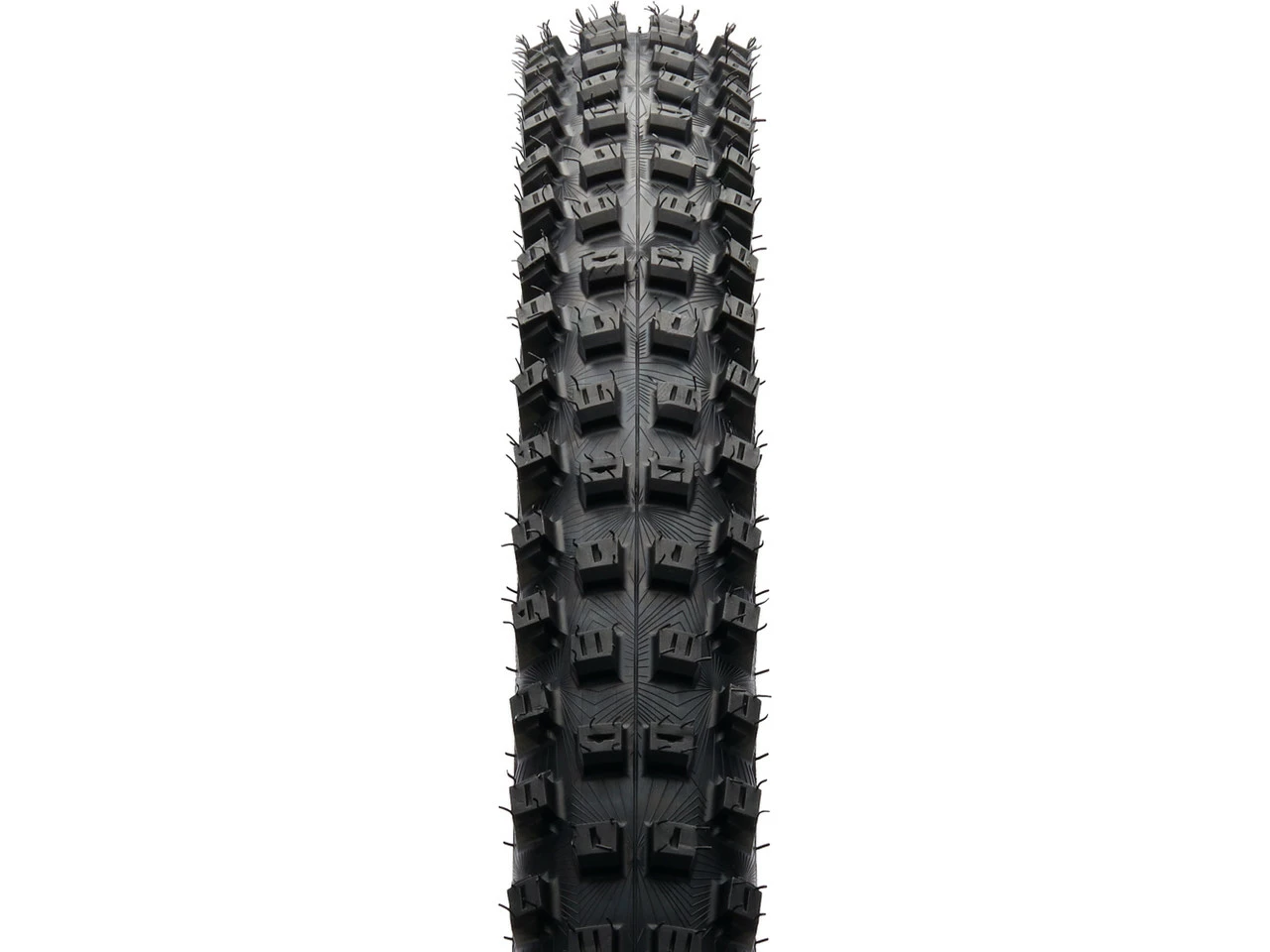 Die Downhill-Karkasse besteht aus sechs Lagen Karkassenmaterial unter der Lauffläche und vier Lagen an den Seiten, die Apex-Einlage über dem Wulst verringert das Risiko von Durchschlägen. Ein kreuzgewebtes Nesselband über dem Reifenfuß schützt zusätzlich Reifen und den Felgenbereich.