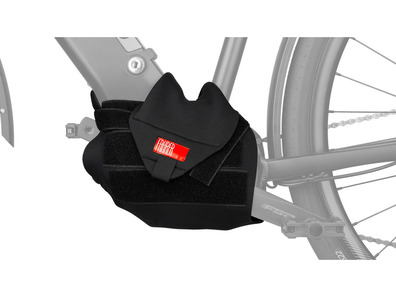 Die Motor Cover Premium Schutzhülle von FAHRER bewahrt den E-Bike-Mittelmotor beim Fahrradtransport mit dem Auto vor direktem Kontakt mit Spritzwasser.