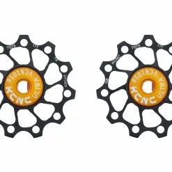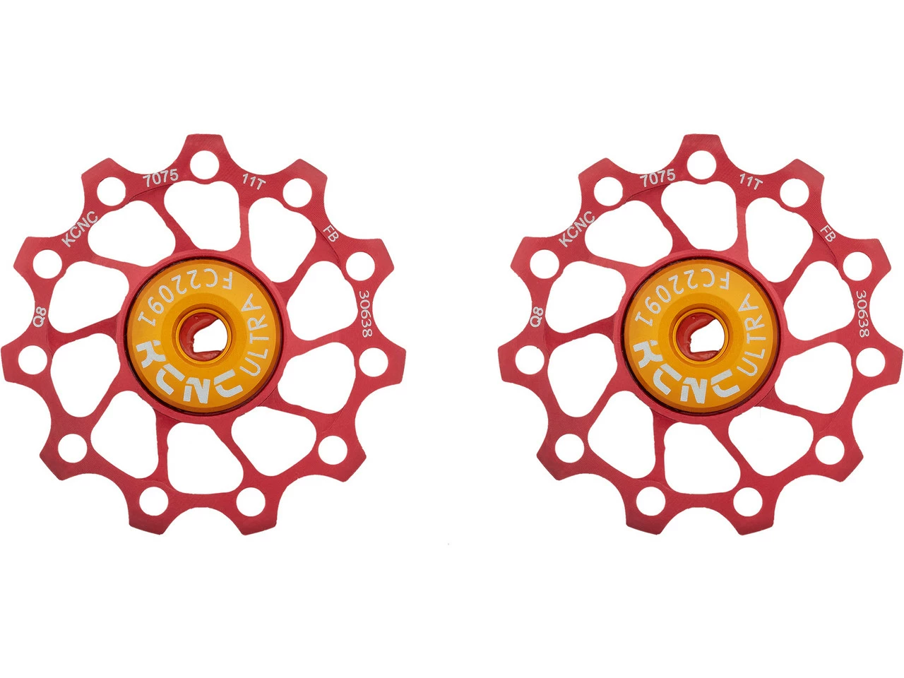 Technische Daten:Material:Aluminium 7075-T6, CNC-gefertigtLagerung:IndustrielagerZähnezahl:10 / 11 / 12 / 13 ZKompatibilität:CampagnoloShimanoSRAM X0, Force, RedFeatures:CNC-gefrästmit hochwertigen Industrielagern ausgestattethochwertige Eloxierungspezielle Anti-Schmutz-BeschichtungLieferumfang:1 Paar Schalträdchen KCNC Jockey Wheel Ultra Light