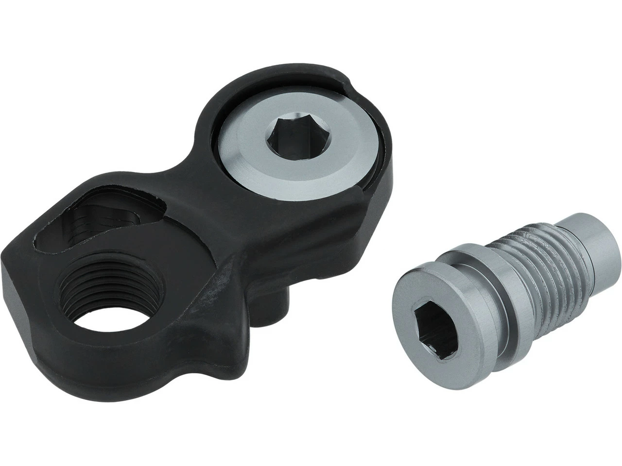 Diese zweiteilige Befestigungsachse ist ein Ersatzteil für das elektronische Dura-Ace Di2 Road-Schaltwerk RD-R9150 von Shimano. Es handelt sich um die Aufhängungseinheit für die Standard-Montage sowie die sogen. B-Achse 2 für die Direct-Mount-Montage. Zwischen der Halterung und dem Schaltauge darf kein Spalt zu erkennen sein. Bei Direct-Mount-Montage kommt nur die B-Achse zum Einsatz.