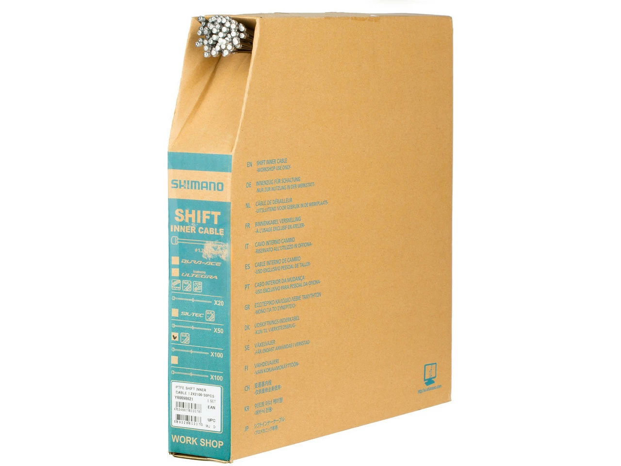 Die Edelstahl Schaltzüge von Shimano gibt es auch in einer 100er Box. Mit ihrer speziellen Form und ihrer Glätte minimieren sie die Reibung und fördern flüssiges Schalten. Im Inneren jedes Zugs befinden sich sechs Drähte, welche einen runden Querschnitt ergeben. Zwölf weitere Drähte sind um den Kern herum angeordnet und von ihrer Form her auf Leichtgängigkeit der Schaltung ausgelegt.