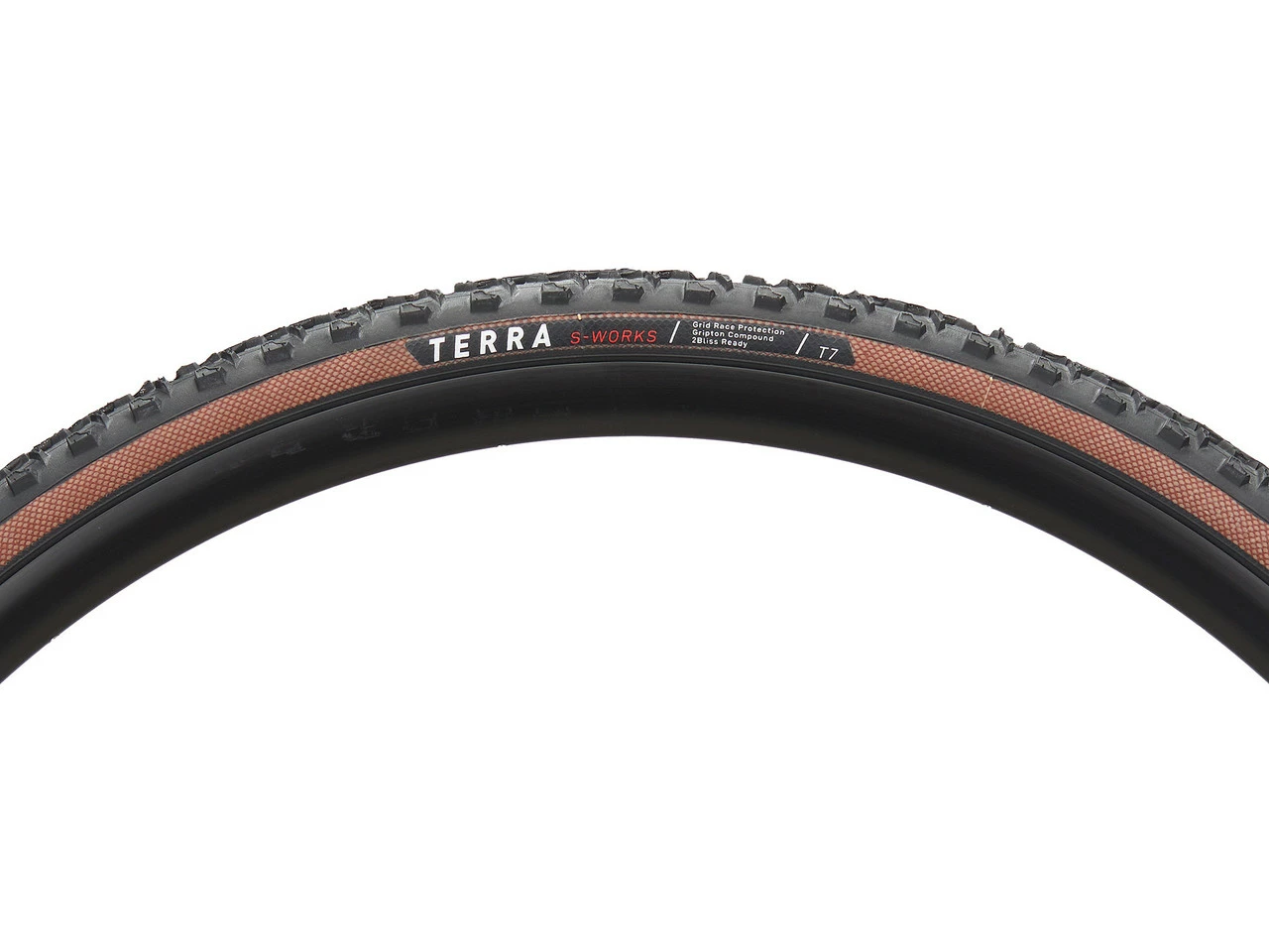 Mit dem S-Works Terra Faltreifen von Specialized fühlst Du Dich bei schlammigen, nassen Cyclocross-Rennen zu Hause. Er hat ein grobstolliges Profil und basiert auf der GRIPTON®-T7-Gummimischung, die Runde für Runde Top-Traktion bietet. Seine 120-tpi-Karkasse ist leicht und geschmeidig und wurde mit dem Grid-Race-Pannenschutz ausgestattet. Dabei handelt es sich um eine kreuzgewebte Polyamid-Schicht, die Durchstiche abwehrt und dabei mit geringem Gewicht sowie Elastizität für besseres Feedback vom Boden punktet. Natürlich ist der S-Works Terra 2Bliss Ready, d. h. Du kannst ihn ohne Schlauch und mit geringem Reifendruck fahren. Dank seiner 33 mm Breite ist er außerdem völlig UCI-konform.