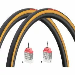 Dieses Bundle besteht aus zwei 26 mm breiten Specialized Turbo Cotton 28″ Faltreifen und zwei passenden Competition Latex Schläuchen von Vittoria. Denn nach wie vor gilt, dass Clincher-Reifen mit Schlauch gerade bei Rennen auf schwierigem Untergrund absolutes Siegpotenzial haben. Der Turbo Cotton ist ein hochleistungsfähiger Rennradreifen mit Baumwollkarkasse. Deren feines 320-tpi-Gewebe sorgt in Kombination mit dem exklusiven GRIPTON®-Compound für geschmeidiges Abrollverhalten und Speed, wobei auch auf ein niedriges Gewicht geachtet wurde. Für mehr Sicherheit hat Specialized in der teilweise transparenten Seitenwand des Reifens einen schwarzen Pannenschutzgürtel eingezogen. Der Vittoria Competition Latex Schlauch bietet wettkampftaugliche Performance und punktet mit geringem Gewicht, wenig Reibung sowie reduziertem Rollwiderstand. So bestehst Du Deinen nächsten Frühjahrsklassiker mit Bravour.